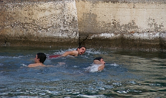 | Seventh (heaven) photostop: Crete 2011-10-01 to ->. Page 43. Friday Jan. 6, 2012 - Theophany in Kalyves. The Theophany Day includes a long service in the church, blessing water, distrubuting blessed water, blessing the people participitating in the ceremony, and a procession to the beach where the sea is blessed by the priest throwing the cross into the sea. The brave-hearts dive into the sea to compete who's the first one to bring the cross back to the priest. The competition is repeated three times.